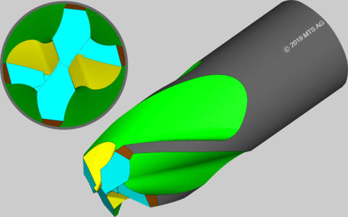 •Sonderanschliff mit 4 Zähnen/Nuten: Die 4 Hauptschneiden bestehen jeweils aus 4-Flächen-Anschliffen mit 4-Flächen-Eckenfasen. Die Hauptgruppe verfügt dabei über einem klassischen 4-Flächenanschliff, während die Nebengruppe verkürzte Zähne aufweist (analog zu einem 4-schneidigem Fräser mit 2-zum-Zentrum-Stirngeometrie).Forstner-Bohrer.•Der 2-stufige Giga-Drill besteht aus einerklassischen Mehrfasenbohrer-Geometrie.•Werkzeug: 6040017 „GIGA-Drill“