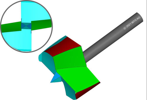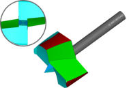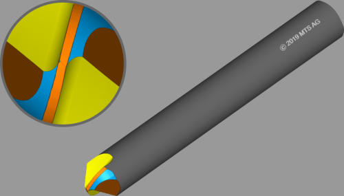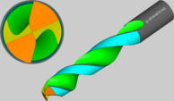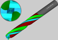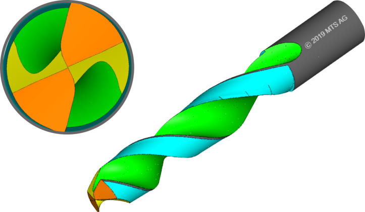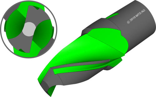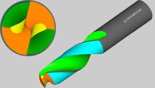 •Special point with 4 teeth / flutes: •There are 4 main cutting edges, each including a 4-facet-points and a 4-facet-chamfer, splitted into two groups. The main group is constructed by a typical 4-facet-point while the secondary group is done by shortened teeth. (like a end mill tool with 2-to-center-geometry).•The two-stepped Giga-Drill is like a typical subland-drill-geometry.•Tool: 6040017 6.1 Basic Drillsr + 6.5 GIGA