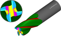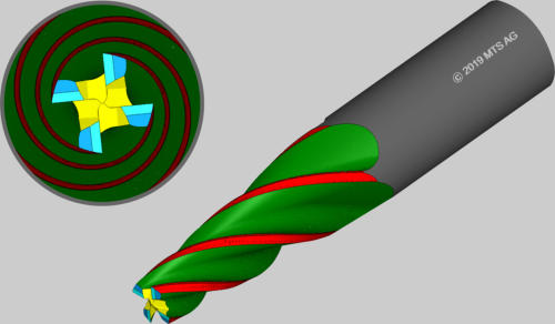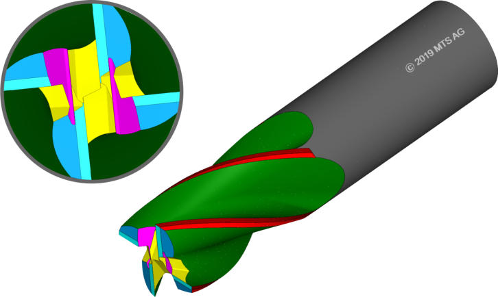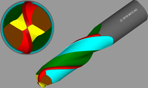 •Cylindrical tools•Roughing cutting corresponding to a sinusoidal cutting edge along the helix •Period and amplitude of wave according to sinus-function•Starting point offset at every tooth•Orientation of wave to the tool-center or to the cutting edge•Tool: 1030017 „Wavecut“