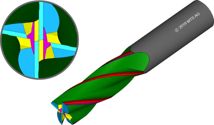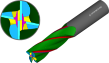 •2, 3 or 4 teeth tools with two crosswise cutting edges for each tooth:•Primary fluting: right helix•Cross cutting: left helix•Axial and radial tooth offset•Tool: 2010017 „Multi cutter endmills with crosswise cutting“